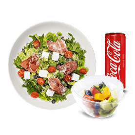 1 Salade au choix + Pain offert à la demande + 1 Dessert au choix + 1 Boisson 33cl au choix.