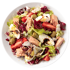 Salade verte, tomates, pommes de terre, thon, oeuf, olives + Pain offert à la demande.