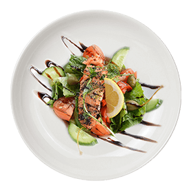 Salade verte, tomates, saumon fumé, avocat, crème fraîche + Pain offert à la demande.