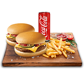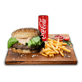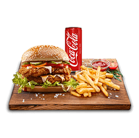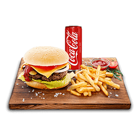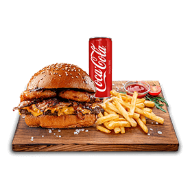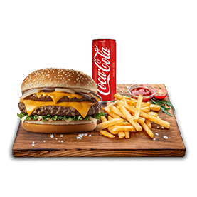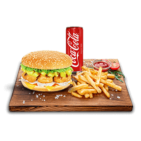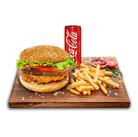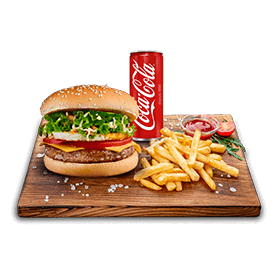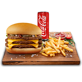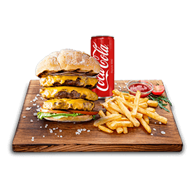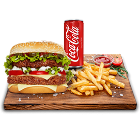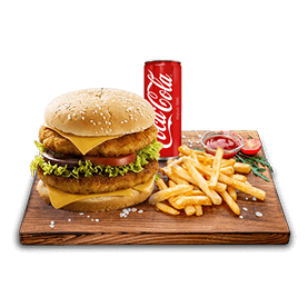 Poulet pané 180gr, 1 steak 180gr, fromage + Frites + 1 Boisson 33cl au choix.