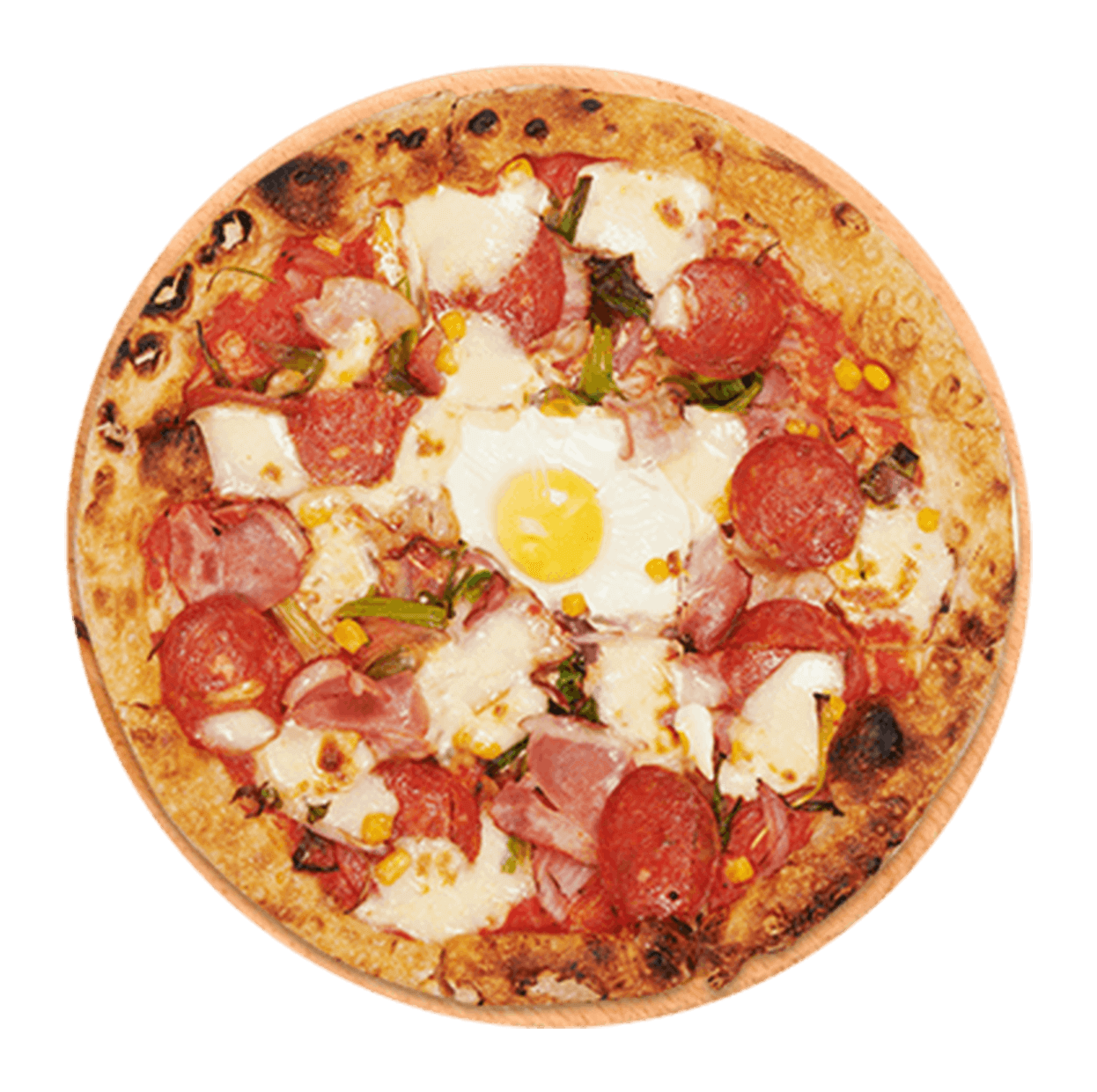Sauce tomate, mozzarella, lardons, oeuf.